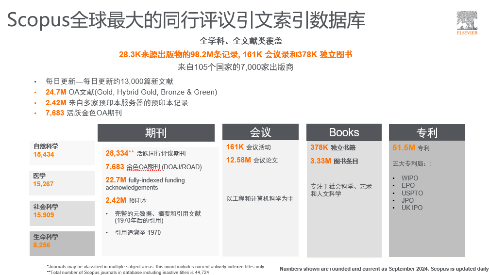 Scopus是爱思唯尔于2004年推出的,目前全球领先的同行评议内容学术论文摘要和引文数据库。Scopus数据库收录了1788年以来由7000多家出版商出版的26000多种期刊,约27万本全球重要学术专著、1400多万全球会议论文以及4800万专利。覆盖自然科学、医学、社会科学、生命科学四个大类,27个大学科,334个小学科。