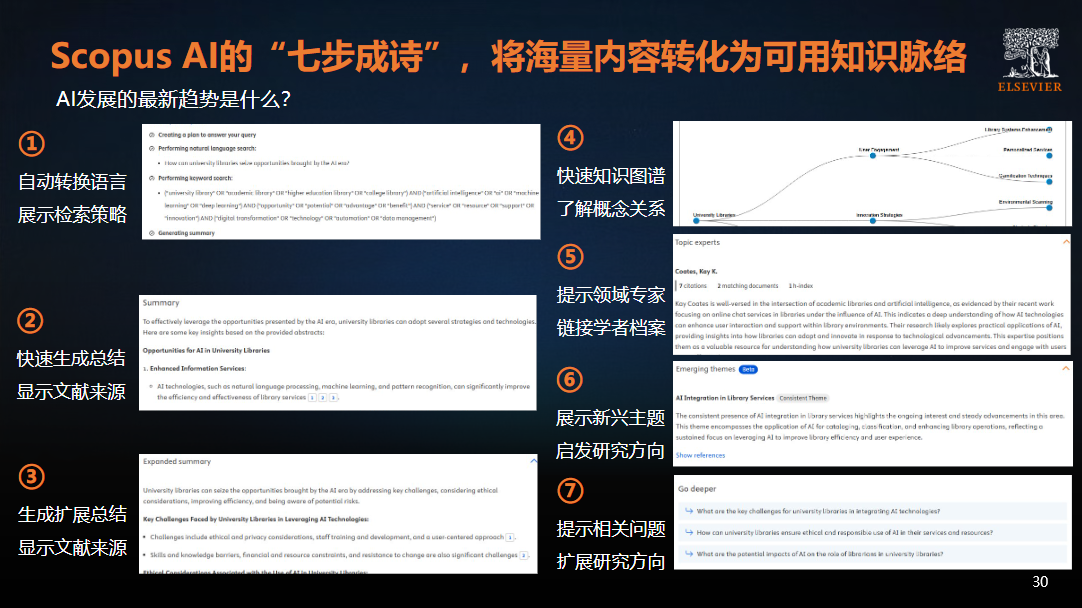 Scopus AI数据库,其是爱思唯尔于2024年推出的基于可信数据源的生成式AI科研助助手,它将生成式AI技术与全球最大的同行评议索引数据库Scopus中经同行评议的高质量内容和数据相结合,以可信赖的科研信息,帮助科研人员更快速地获得某个研究领域的深刻洞见。